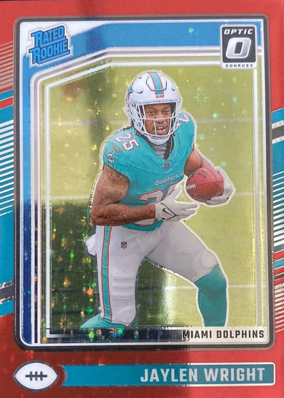 The Jaylen Wright 2024 Optic #249 Red Stars /(SSP) Rookie card in Raw condition has not changed in price in the last 30 days and was last sold for $2.00 .