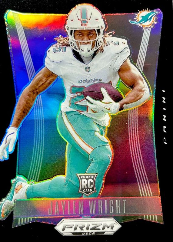 The Jaylen Wright 2024 Prizm Deca #201 Black /1 Rookie card in Raw condition has not changed in price in the last 30 days and was last sold for $256.33 .