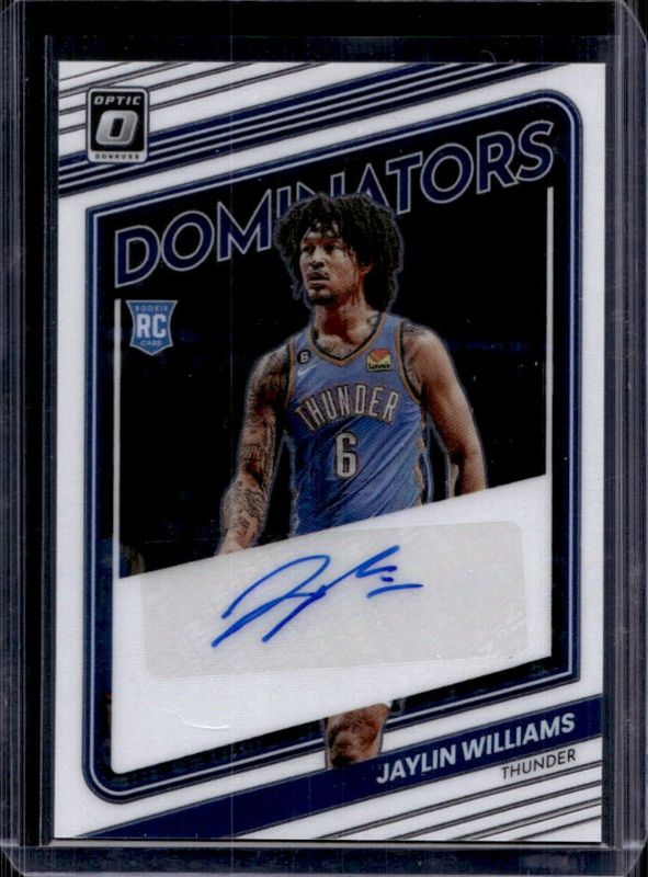 The Jaylin Williams 2022 Optic #RDS-JYW Rookie Dominators Signatures card is 1 of 77 Jaylin Williams' card variations in the 2022 Optic set being tracked by Sports Card Investor, including Base, Checkerboard, Choice, Choice Red & Green, and Fast Break.