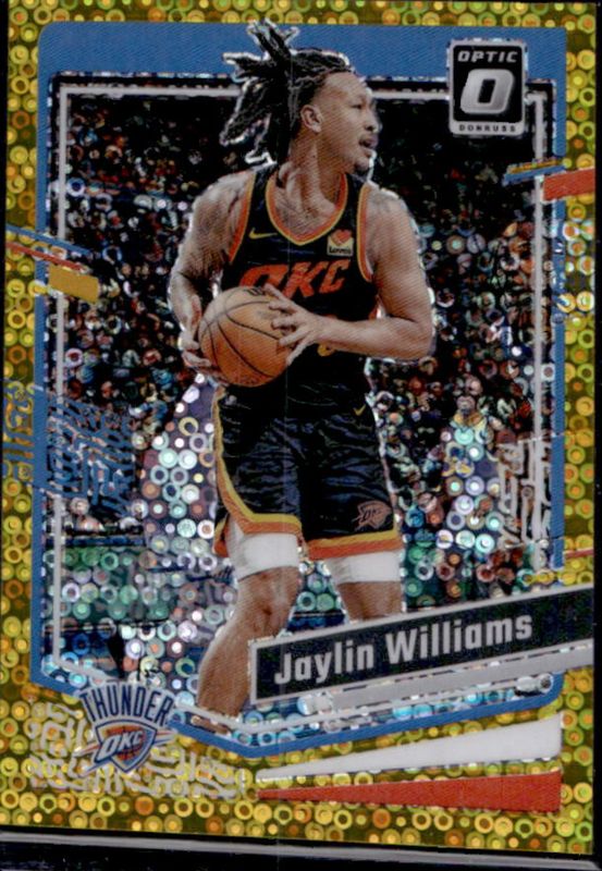 The Jaylin Williams 2023 Optic #150 Fast Break Gold /10 card is 1 of 55 Jaylin Williams' card variations in the 2023 Optic set being tracked by Sports Card Investor, including Base, Blue Velocity, Checkerboard, Choice Red & Green, and Fast Break.