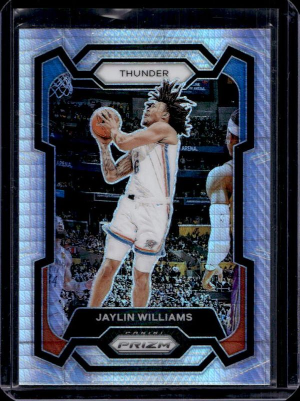 The Jaylin Williams 2023 Prizm #214 Hyper card is 1 of 66 Jaylin Williams' card variations in the 2023 Prizm set being tracked by Sports Card Investor, including Base, Blue Wave, Choice Blue Yellow Green, Fast Break, and Green.