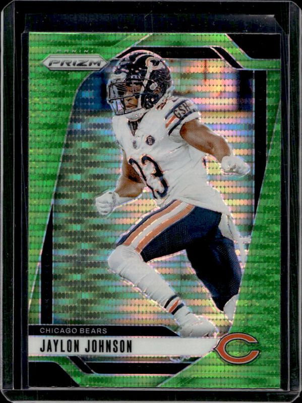 The Jaylon Johnson 2024 Prizm #51 Neon Green Pulsar card is 1 of 84 Jaylon Johnson's card variations in the 2024 Prizm set being tracked by Sports Card Investor, including Base, Choice Blue Yellow Green, Choice Silver, Disco, and Green.
