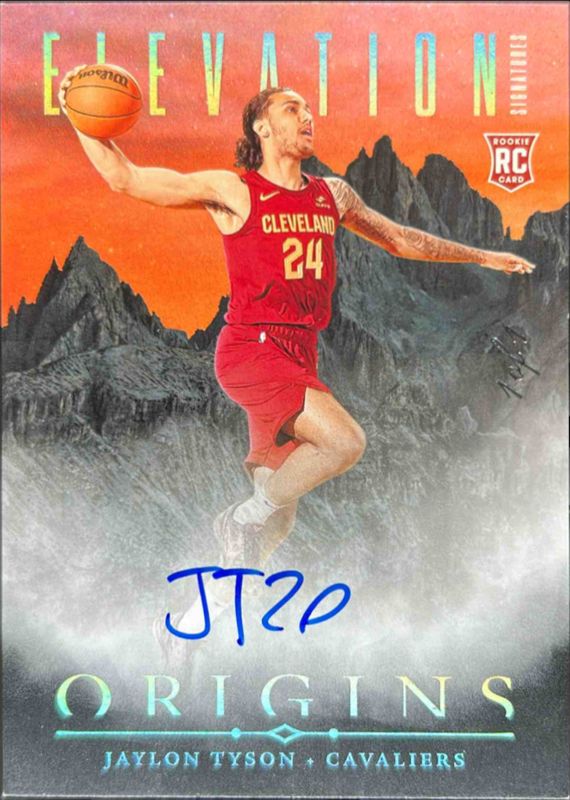 The Jaylon Tyson 2024 Origins #ES-TYS Elevation Signatures - Black Inscription /1 Rookie card is 1 of 64 Jaylon Tyson's card variations in the 2024 Origins set being tracked by Sports Card Investor, including Base, Basketballs, Cosmos, Tessellated, and Red /299.