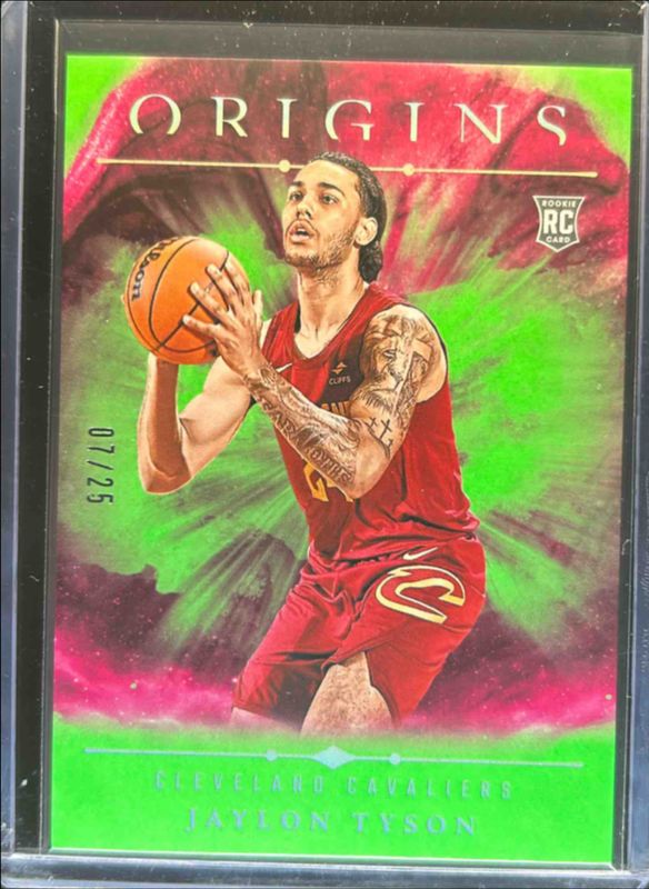 The Jaylon Tyson 2024 Origins #71 Neon Green /25 Rookie card is 1 of 64 Jaylon Tyson's card variations in the 2024 Origins set being tracked by Sports Card Investor, including Base, Basketballs, Cosmos, Tessellated, and Red /299.