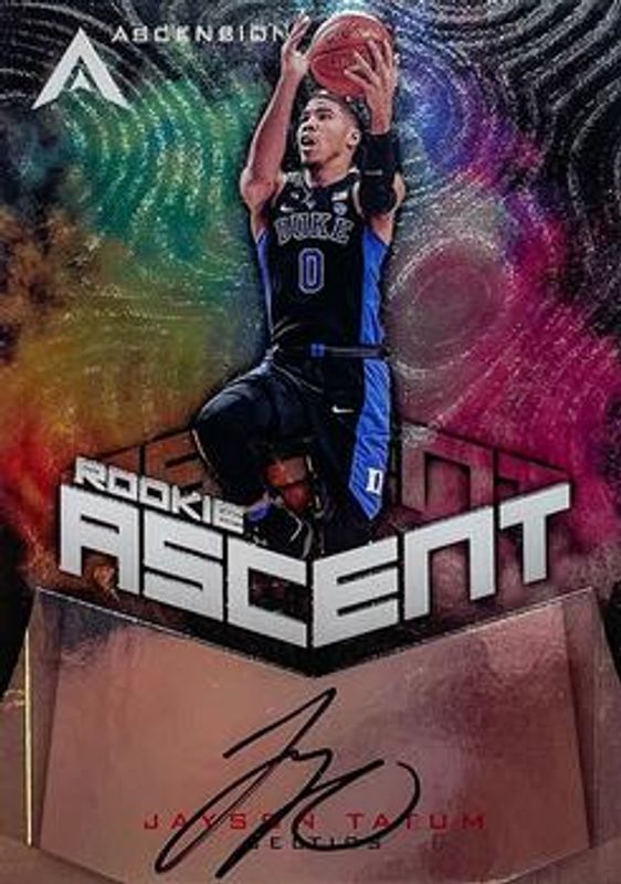 The Jayson Tatum 2017 Ascension #ASC-JAY Rookie Ascent Autographs /299 card is 1 of 18 Jayson Tatum's card variations in the 2017 Ascension set being tracked by Sports Card Investor, including #130a Base, #130b Base, #130a Blue /125, #130b Blue /125, and #130b Red /75.
