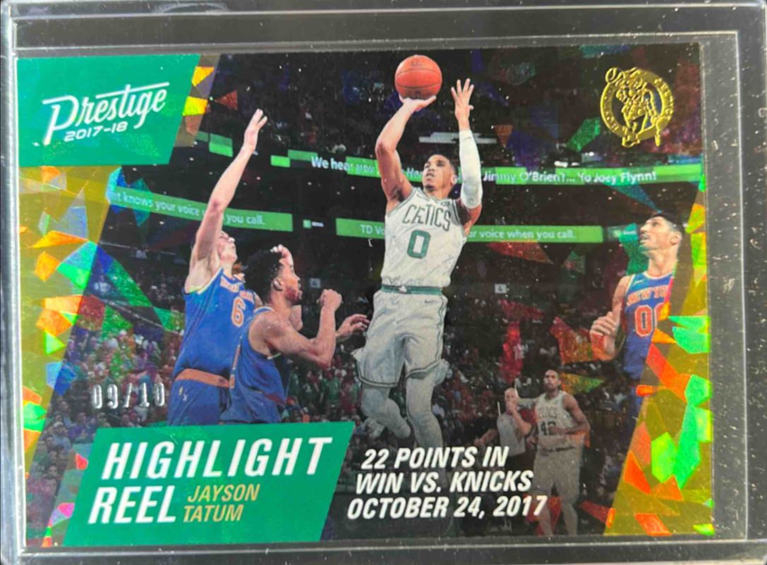 The Jayson Tatum 2017 Prestige #7 Highlight Reel - Crystal Gold /10 Rookie card is 1 of 34 Jayson Tatum's card variations in the 2017 Prestige set being tracked by Sports Card Investor, including Base, Bonus Shots Signatures, Bonus Shots Signatures - Crystal, Highlight Reel - Crystal, and Highlight Reel - Horizon.