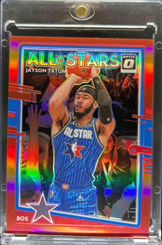 The Jayson Tatum 2020 Optic #10 All-Stars - Red /99 card is 1 of 100 Jayson Tatum's card variations in the 2020 Optic set being tracked by Sports Card Investor, including Base, Blue Pulsar, Blue Velocity, Checkerboard, and Choice Red & Green.