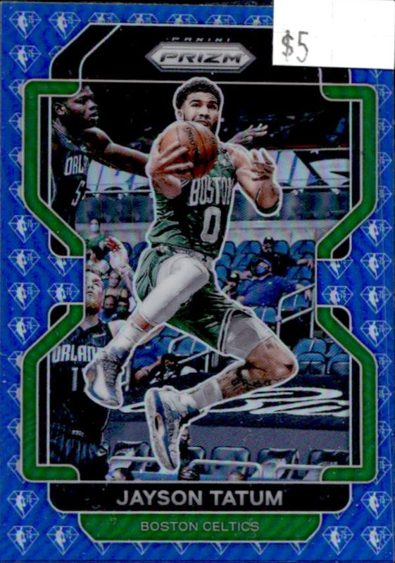 The Jayson Tatum 2021 Prizm #13 Blue NBA 75th Anniversary card is 1 of 100 Jayson Tatum's card variations in the 2021 Prizm set being tracked by Sports Card Investor, including #13 Base, #13b Base, #13 Blue Wave, #13 Choice Blue Yellow Green, and #13 Factory Set Blue Hyper.