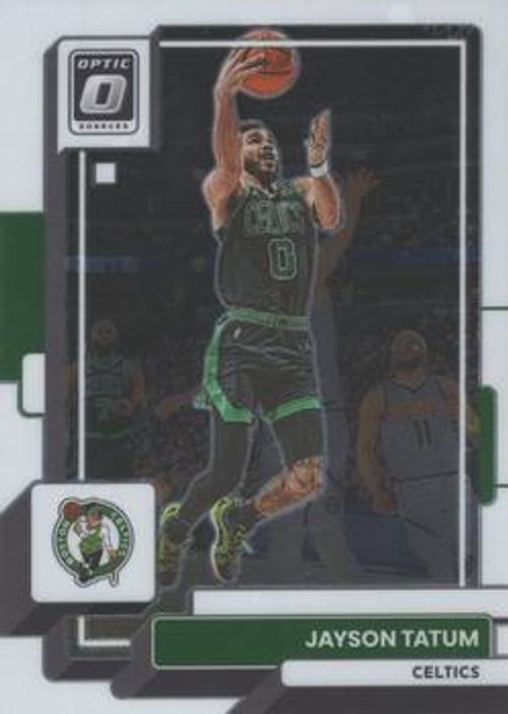 The Jayson Tatum 2022 Optic #8 Base card is 1 of 131 Jayson Tatum's card variations in the 2022 Optic set being tracked by Sports Card Investor, including Checkerboard, Choice Red & Green, Fast Break, Green Shock, and Holo.