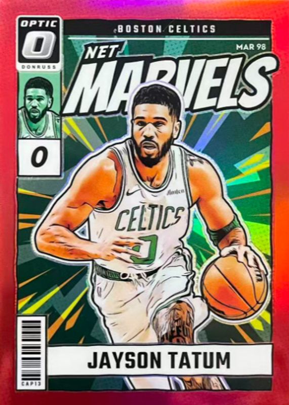The Jayson Tatum 2024 Optic #1 Net Marvels - Red /99 card in Raw condition has moved down -$4.13 (-12.9%) in the last 30 days and was last sold for $27.99 .