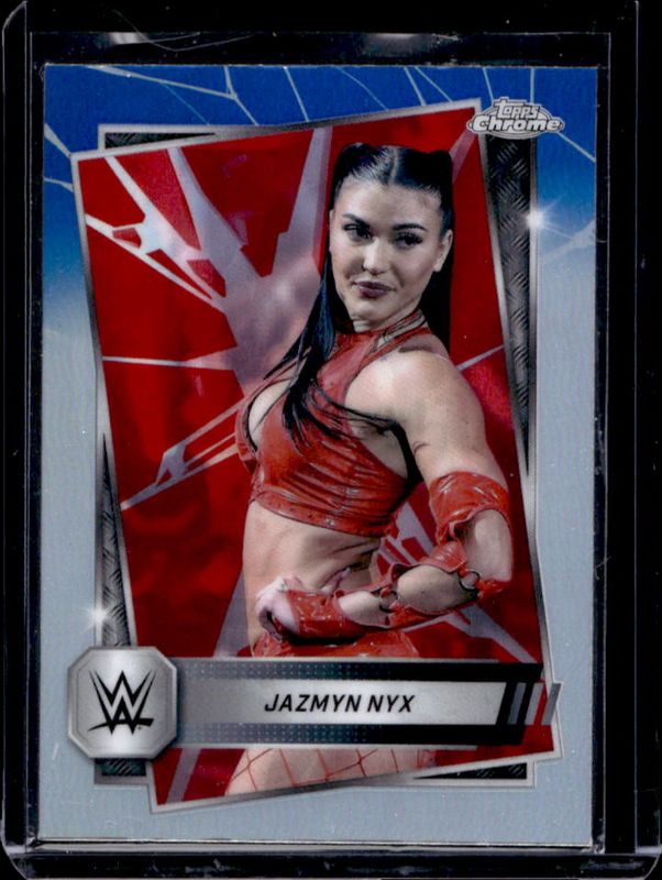 The Jazmyn Nyx 2025 Topps Chrome WWE #41 Red & Blue Refractor card is 1 of 50 Jazmyn Nyx's card variations in the 2025 Topps Chrome WWE set being tracked by Sports Card Investor, including Base, Black & Gold Refractor, Geometric Refractor, Neon Green & Black Refractor, and Pink Shimmer Refractor.