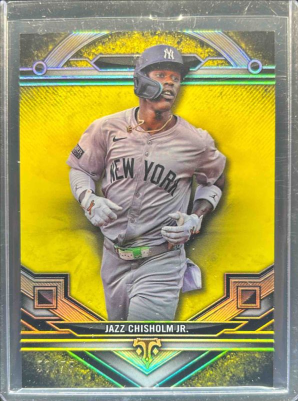 The Jazz Chisholm Jr. 2024 Topps Triple Threads #28 Citrine /75 card is 1 of 98 Jazz Chisholm Jr.'s card variations in the 2024 Topps Triple Threads set being tracked by Sports Card Investor, including Base, Amber /199, Aquamarine /149, Tourmaline /125, and Gold /99.