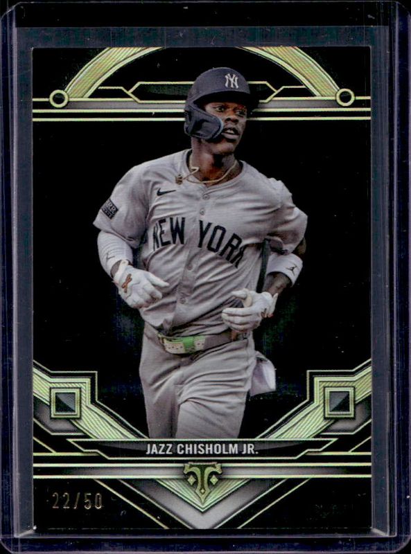 The Jazz Chisholm Jr. 2024 Topps Triple Threads #28 Onyx /50 card is 1 of 98 Jazz Chisholm Jr.'s card variations in the 2024 Topps Triple Threads set being tracked by Sports Card Investor, including Base, Amber /199, Aquamarine /149, Tourmaline /125, and Gold /99.