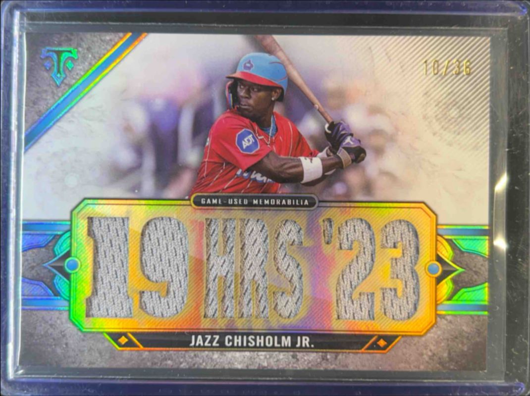 The Jazz Chisholm Jr. 2024 Topps Triple Threads #TTR-JAZ4 Relics /36 card is 1 of 98 Jazz Chisholm Jr.'s card variations in the 2024 Topps Triple Threads set being tracked by Sports Card Investor, including Base, Amber /199, Aquamarine /149, Tourmaline /125, and Gold /99.