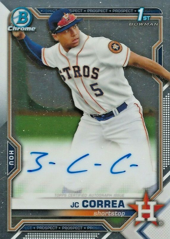 JC Correa's Baseball cards are available in at least 1 sets. JC Correa's biggest 7-day price movers are 2021 Bowman Chrome #CPA-JCO Prospect Auto (1st), and 2021 Bowman Chrome #CPA-JCO Prospect Auto - Refractor /499 (1st).