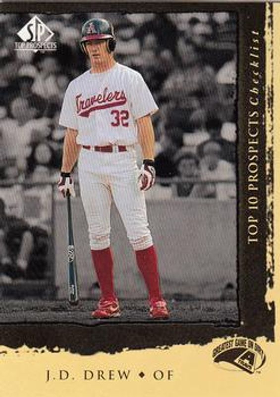 The JD Drew 1999 SP Top Prospects #1 Base Rookie card is 1 of 6 JD Drew's card variations in the 1999 SP Top Prospects set being tracked by Sports Card Investor, including #51 Base, #1 President's Edition /10, #51 President's Edition /10, #GF13 Great Futures, and #D13 Destination: The Show /100.