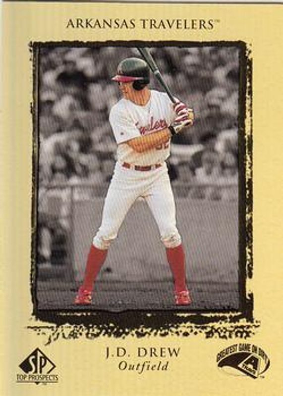 The JD Drew 1999 SP Top Prospects #51 Base Rookie card is 1 of 6 JD Drew's card variations in the 1999 SP Top Prospects set being tracked by Sports Card Investor, including #1 Base, #1 President's Edition /10, #51 President's Edition /10, #GF13 Great Futures, and #D13 Destination: The Show /100.