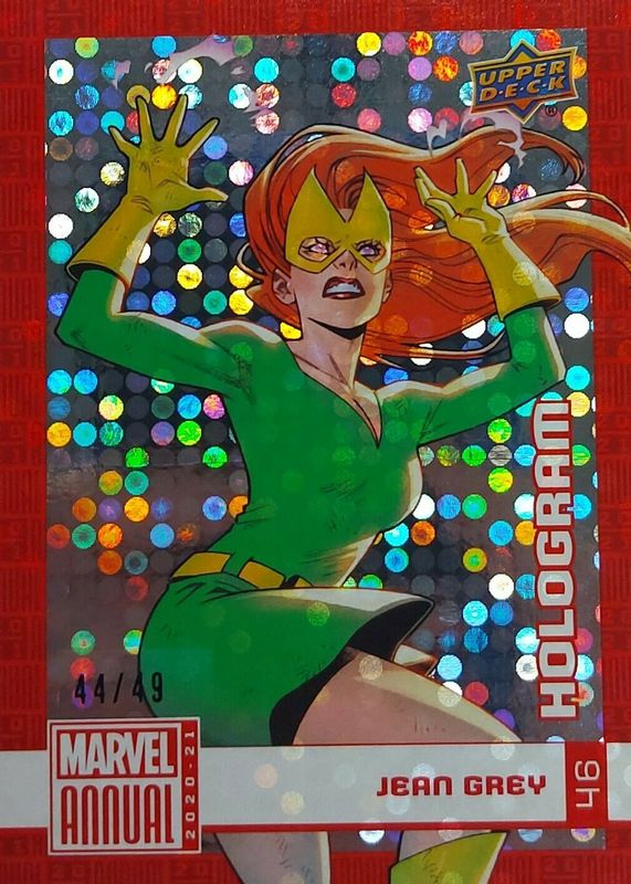 The Jean Grey 2020 Annual #46 Foilboard Hologram /49 card in Raw condition has not changed in price in the last 30 days and was last sold for $24.99 .