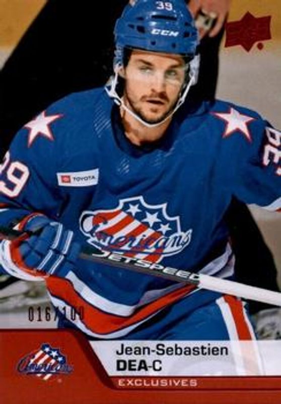 The Jean-Sebastien Dea 2020 Upper Deck AHL #137 UD Exclusives /100 card is 1 of 13 Jean-Sebastien Dea's card variations in the 2020 Upper Deck AHL set being tracked by Sports Card Investor, including #137 Base, #236 Base, #236 Red, #236 Gold /25, and #137 UD High Gloss /10.