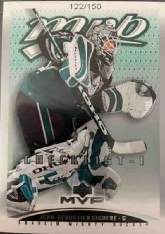 The Jean-Sebastien Giguere 2003 Upper Deck MVP #440 Silver Script /150 card is 1 of 13 Jean-Sebastien Giguere's card variations in the 2003 Upper Deck MVP set being tracked by Sports Card Investor, including #440 Base, #14 Base, #14 Silver Script /150, #14 Gold Script /25, and #440 Gold Script /25.