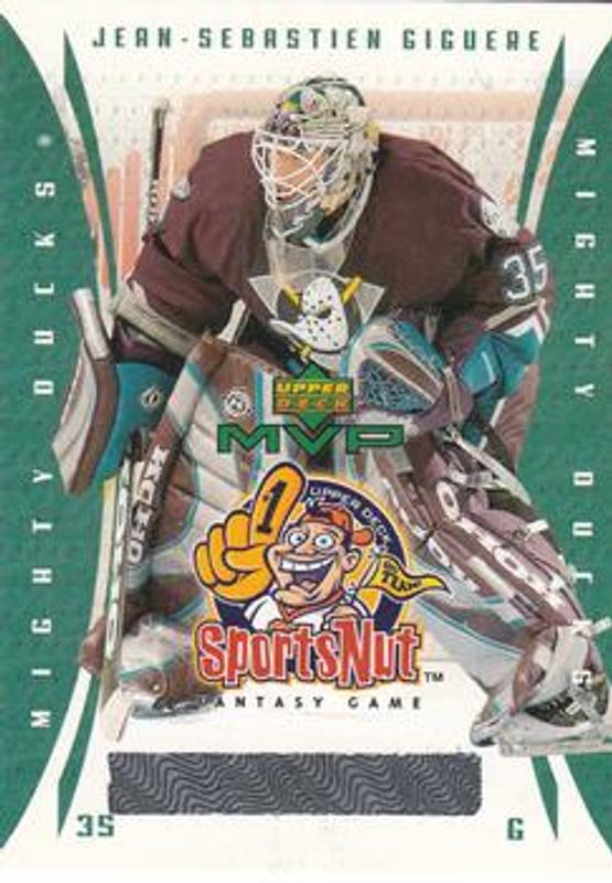 The Jean-Sebastien Giguere 2003 Upper Deck MVP #SN1 SportsNut card is 1 of 13 Jean-Sebastien Giguere's card variations in the 2003 Upper Deck MVP set being tracked by Sports Card Investor, including #440 Base, #14 Base, #440 Silver Script /150, #14 Silver Script /150, and #14 Gold Script /25.