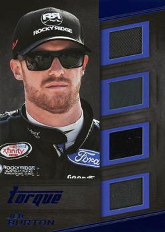The Jeb Burton 2016 Torque NASCAR #QM-JB Quad Materials Blue /99 card is 1 of 32 Jeb Burton's card variations in the 2016 Torque NASCAR set being tracked by Sports Card Investor, including Base, Gold, Blue /125, Red /99, and Artist Proof /50.