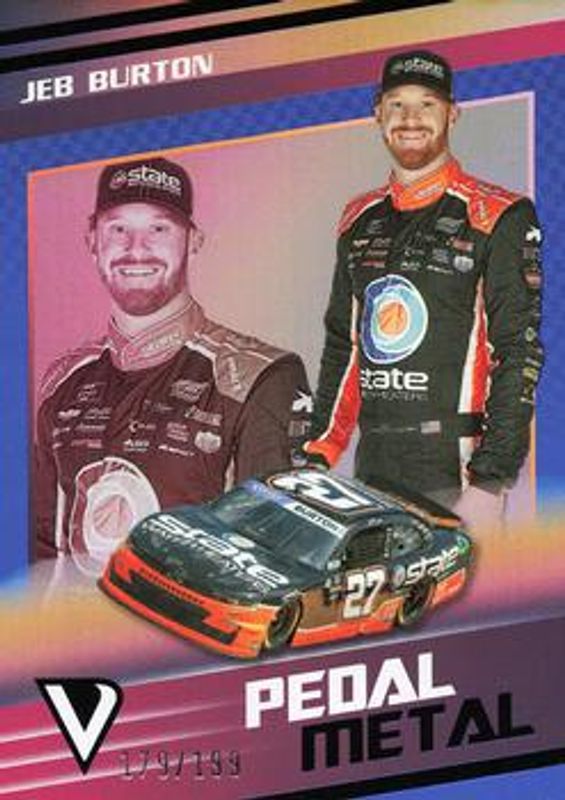 The Jeb Burton 2023 Chronicles NASCAR #8 Pedal to the Metal - Blue /199 card is 1 of 25 Jeb Burton's card variations in the 2023 Chronicles NASCAR set being tracked by Sports Card Investor, including Base, Blue /199, Red /99, Purple /25, and Gold /10.