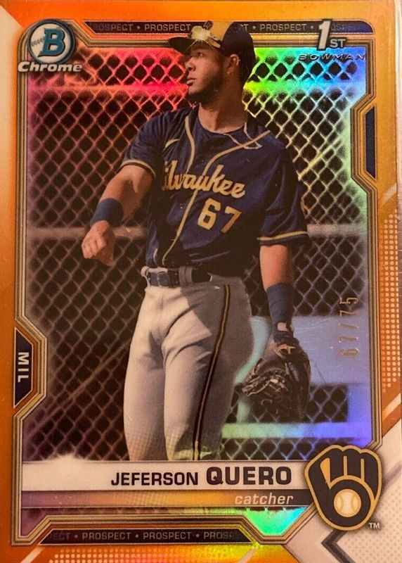 The Jeferson Quero 2021 Bowman Chrome #BCP-181 Prospects - Yellow Refractor /75 (1st) card in Raw condition has not changed in price in the last 30 days and was last sold for $22.50 .