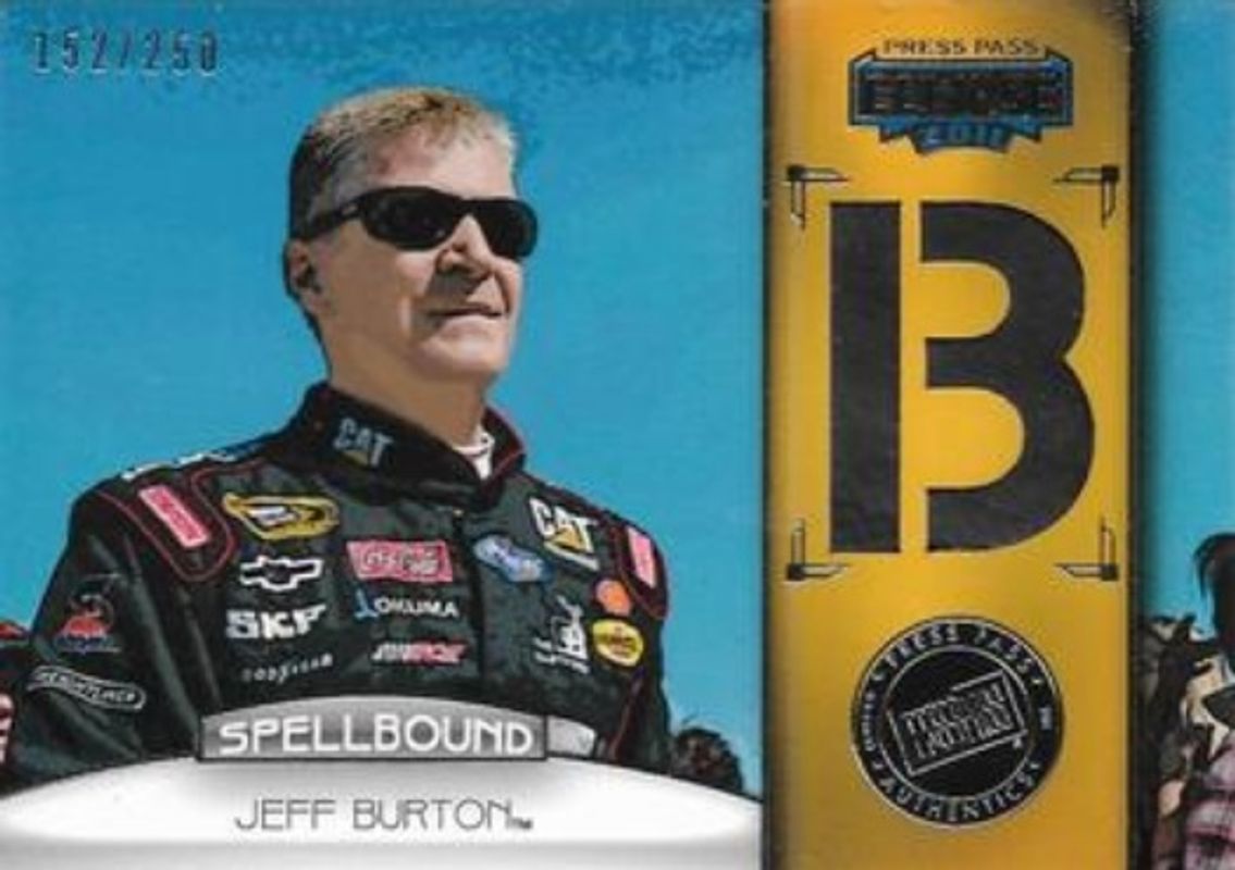 The Jeff Burton 2011 Press Pass Eclipse #SB-JB-1 Spellbound Swatches /250 card is 1 of 16 Jeff Burton's card variations in the 2011 Press Pass Eclipse set being tracked by Sports Card Investor, including #5 Base, #81 Base, #5 Blue, #81 Blue, and #5 Gold /55.