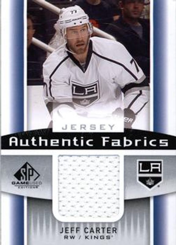 The Jeff Carter 2013 SP Game Used #AF-JC Authentic Fabrics card is 1 of 7 Jeff Carter's card variations in the 2013 SP Game Used set being tracked by Sports Card Investor, including Base /27, Gold Autographs, Authentic Fabrics Patches /35, Authentic Fabrics Fight Straps /15, and Authentic Fabrics Gold /8.