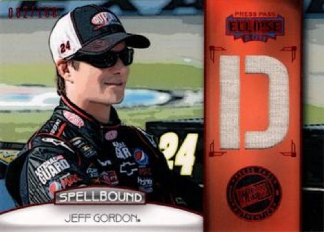 The Jeff Gordon 2011 Press Pass Eclipse #SB-JG4 Spellbound Swatches /250 card is 1 of 25 Jeff Gordon's card variations in the 2011 Press Pass Eclipse set being tracked by Sports Card Investor, including #90 Base, #76 Base, #11 Base, #64 Base, and #76 Blue.