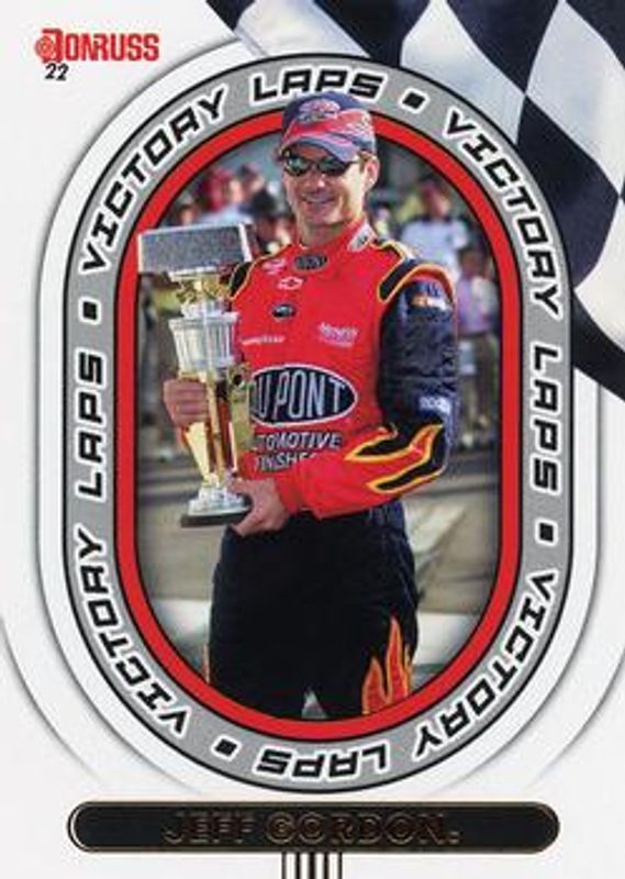 The Jeff Gordon 2022 Donruss NASCAR #VL1 Victory Laps Retail card is 1 of 151 Jeff Gordon's card variations in the 2022 Donruss NASCAR set being tracked by Sports Card Investor, including #51 Base, #135 Base, #154 Base, #3 Base, and #51 Carolina Blue.