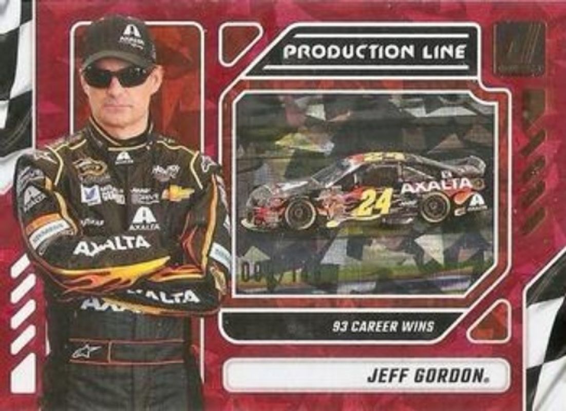 The Jeff Gordon 2024 Donruss NASCAR #3 Production Line Red Ice /149 card is 1 of 103 Jeff Gordon's card variations in the 2024 Donruss NASCAR set being tracked by Sports Card Investor, including #194 Base, #70 Base, #194 Optic, #70 Optic, and #70 Optic Black Pandora.