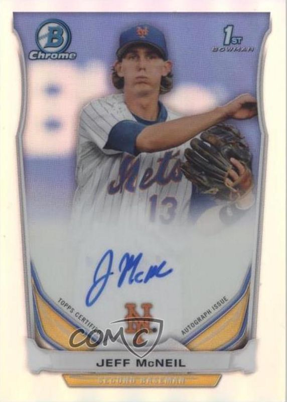 The Jeff McNeil 2014 Bowman Chrome #BCAP-JMC Prospect Auto - Refractor /500 (1st) card in Raw condition has not changed in price in the last 30 days and was last sold for $19.50 .