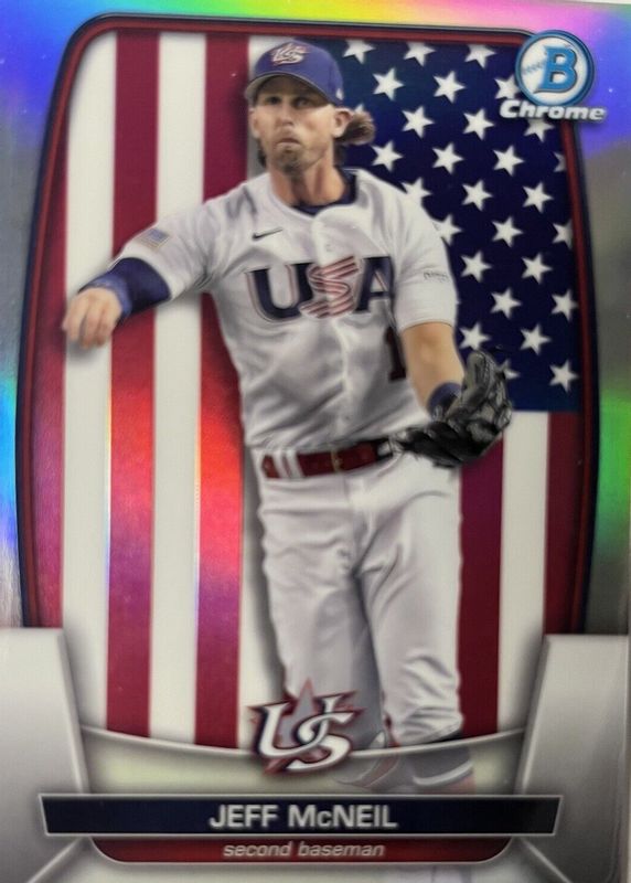 The Jeff McNeil 2023 Bowman Chrome #WBC-87 WBC Flag - Refractor /499 card in Raw condition has moved up $0.75 (+18.8%) in the last 30 days and was last sold for $4.74 .