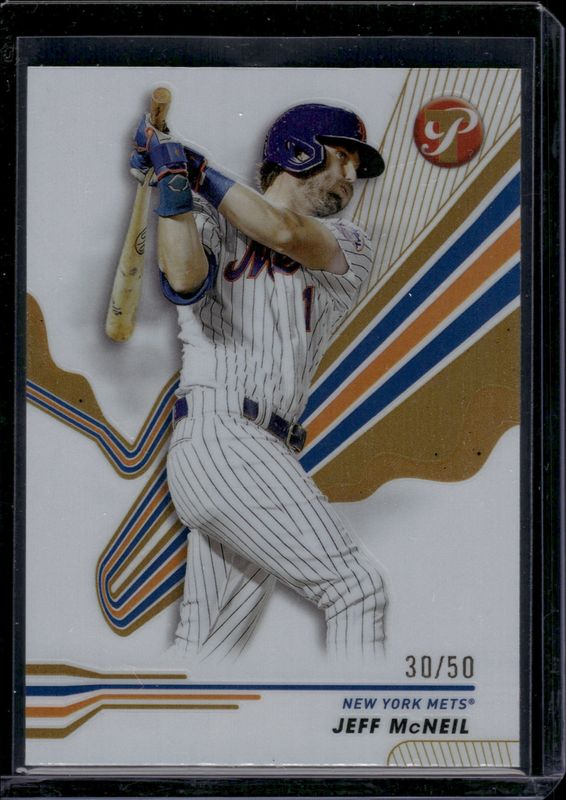 The Jeff McNeil 2024 Topps Pristine #187 Gold Refractor /50 card is 1 of 24 Jeff McNeil's card variations in the 2024 Topps Pristine set being tracked by Sports Card Investor, including Base, Pristine Refractor, Refractor, Green Refractor /150, and Pristine Purple Refractor /99.