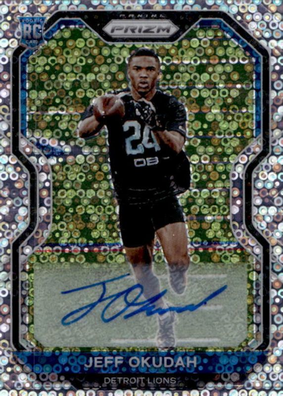 This card is 1 of 18 Jeff Okudah's card variations in the 2020 Prizm set being tracked by Sports Card Investor, including Rookie Autographs, Rookie Autographs - Neon Green Pulsar, Rookie Autographs - Pink, Rookie Autographs - Purple Pulsar, and Rookie Autographs - Red Wave /149.
