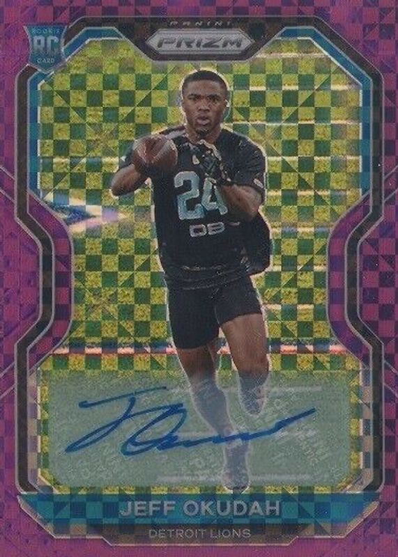 This card is 1 of 18 Jeff Okudah's card variations in the 2020 Prizm set being tracked by Sports Card Investor, including Rookie Autographs, Rookie Autographs - Neon Green Pulsar, Rookie Autographs - No Huddle, Rookie Autographs - Pink, and Rookie Autographs - Purple Pulsar.