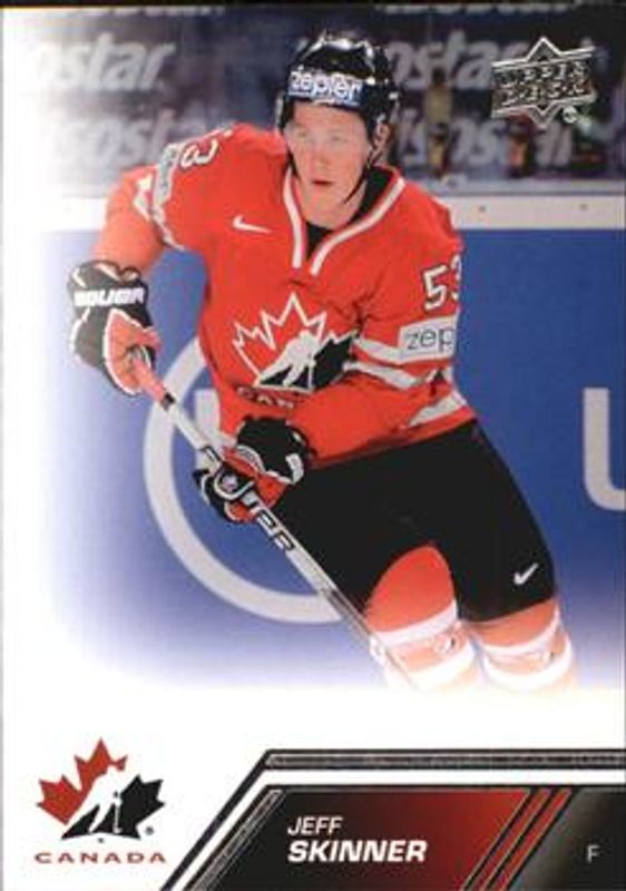 The Jeff Skinner 2013 Upper Deck Team Canada #132 Base card is 1 of 19 Jeff Skinner's card variations in the 2013 Upper Deck Team Canada set being tracked by Sports Card Investor, including #225 Base, #132 Gold Signatures, #225 Exclusive Red /100, #132 Exclusive Red /100, and #132 High Gloss Gold /10.