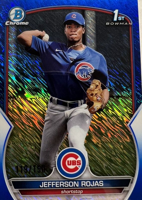 The Jefferson Rojas 2023 Bowman #BCP-70 Chrome Prospects - Blue Shimmer Refractor /150 (1st) card in Raw condition has not changed in price in the last 30 days and was last sold for $19.99 .