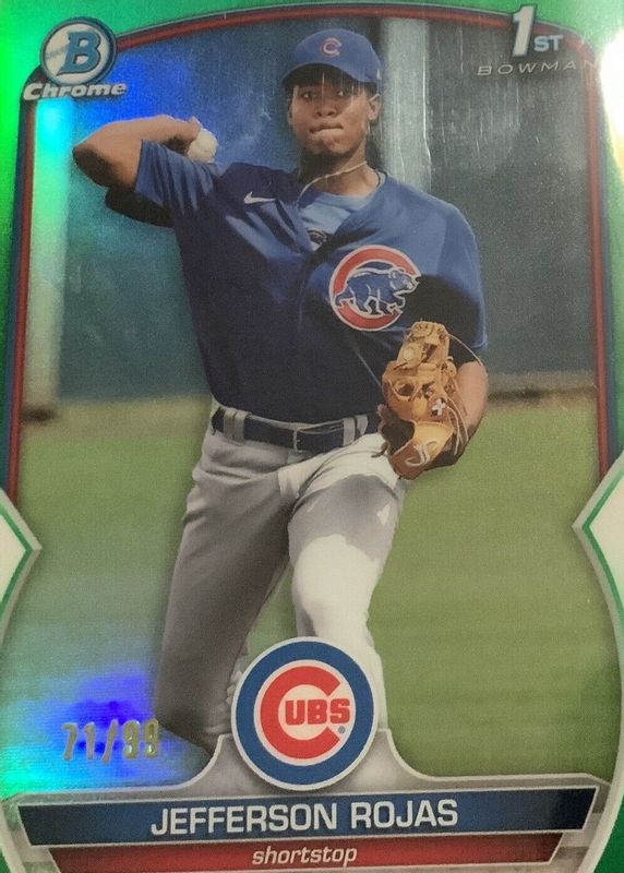 The Jefferson Rojas 2023 Bowman #BCP-70 Chrome Prospects - Green Refractor /99 (1st) card in Raw condition has not changed in price in the last 30 days and was last sold for $12.00 .