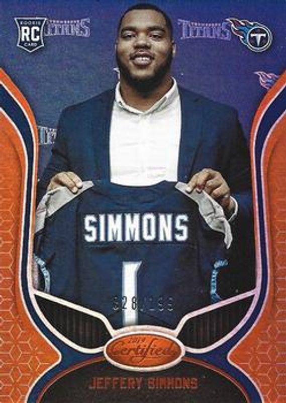 The Jeffery Simmons 2019 Certified #177 Mirror Orange /199 Rookie card is 1 of 9 Jeffery Simmons' card variations in the 2019 Certified set being tracked by Sports Card Investor, including Base, Mirror Red /99, Mirror Teal /35, Mirror Gold /25, and Printing Plates Black /1.