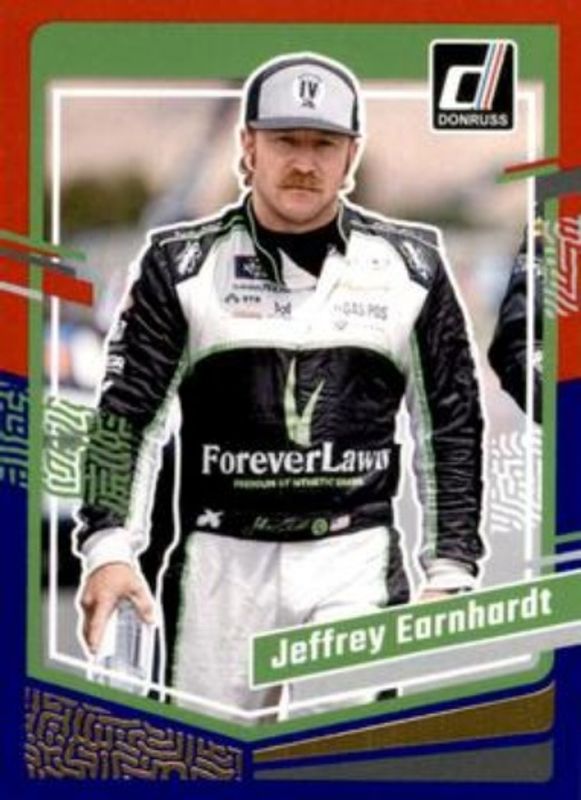 The Jeffrey Earnhardt 2024 Donruss NASCAR #3 Red & Blue card is 1 of 73 Jeffrey Earnhardt's card variations in the 2024 Donruss NASCAR set being tracked by Sports Card Investor, including #3 Base, #134 Base, #134 Optic, #3 Optic, and #134 Optic Black Pandora.