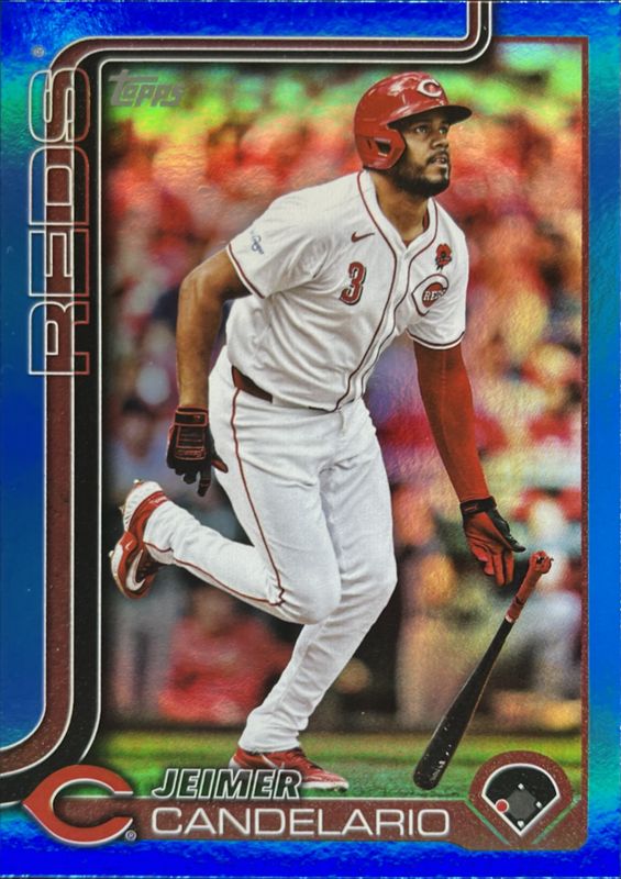 The Jeimer Candelario 2025 Topps #619 Blue Holo Foil /150 card is 1 of 56 Jeimer Candelario's card variations in the 2025 Topps set being tracked by Sports Card Investor, including Base, Aqua Holo Foil, Diamante Foil, Holo Foil, and Pink Diamante Foil.