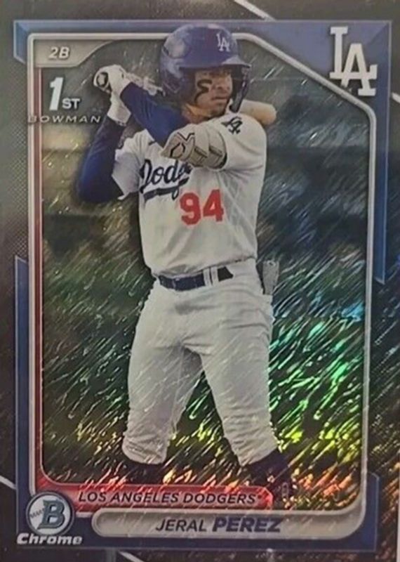 This card is 1 of 51 Jeral Perez's card variations in the 2024 Bowman Chrome set being tracked by Sports Card Investor, including Prospects (1st), Prospects - Shimmer Refractor (1st), Prospects - Refractor /499 (1st), Prospects - Speckle Refractor /299 (1st), and Prospects - Purple Refractor /250 (1st).