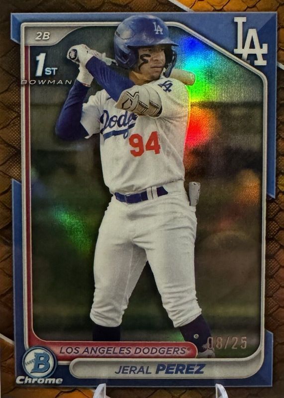 The Jeral Perez 2024 Bowman Chrome #BCP-158 Prospects - Reptilian Orange Refractor /25 (1st) card in Raw condition has not changed in price in the last 30 days and was last sold for $8.50 .