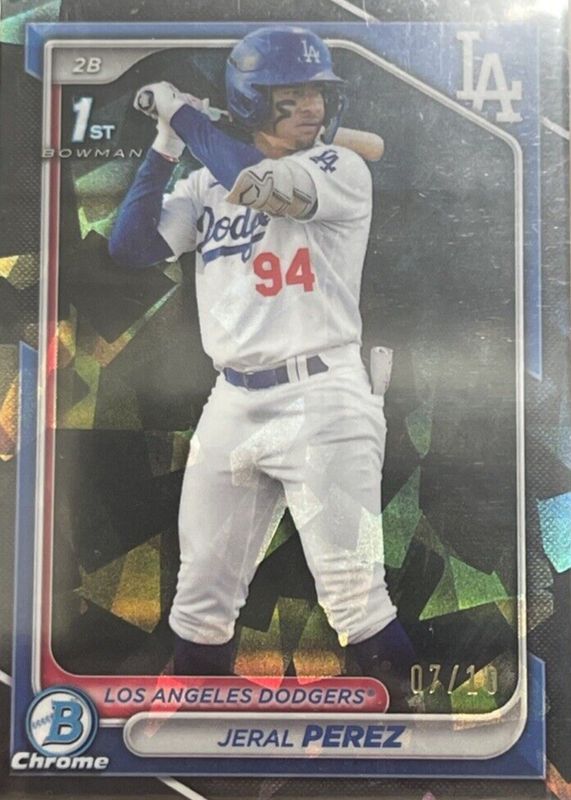This card is 1 of 7 Jeral Perez's card variations in the 2024 Bowman Chrome Sapphire Edition set being tracked by Sports Card Investor, including Prospects (1st), Prospects - Yellow /75 (1st), Prospects - Gold /50 (1st), Prospects - Orange /25 (1st), and Prospects - Red /5 (1st).