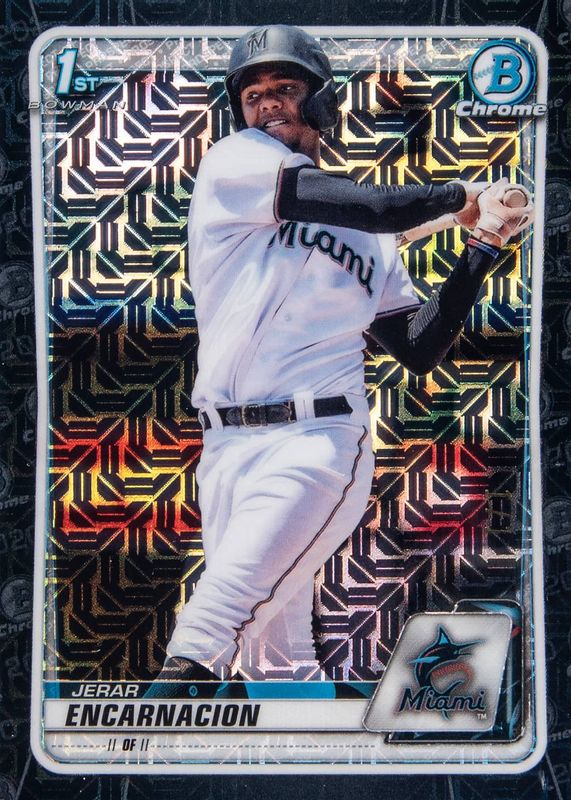 This card is 1 of 10 Jerar Encarnacion's card variations in the 2020 Bowman Mega Box set being tracked by Sports Card Investor, including Chrome Prospects - Mojo Refractor (1st), Chrome Prospects - Purple Mojo Refractor /250 (1st), Chrome Prospects - Pink Mojo Refractor /199 (1st), Chrome Prospects - Blue Mojo Refractor /150 (1st), and Chrome Prospects - Green Mojo Refractor /99 (1st).