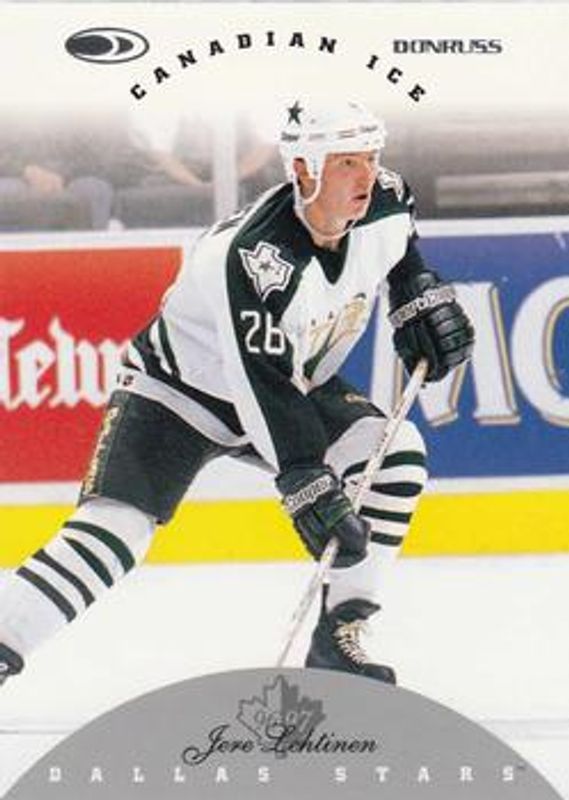The Jere Lehtinen 1996 Donruss Canadian Ice #111 Base card is 1 of 3 Jere Lehtinen's card variations in the 1996 Donruss Canadian Ice set being tracked by Sports Card Investor, including Canadian Gold Press Proofs, and Canadian Red Press Proofs /75.