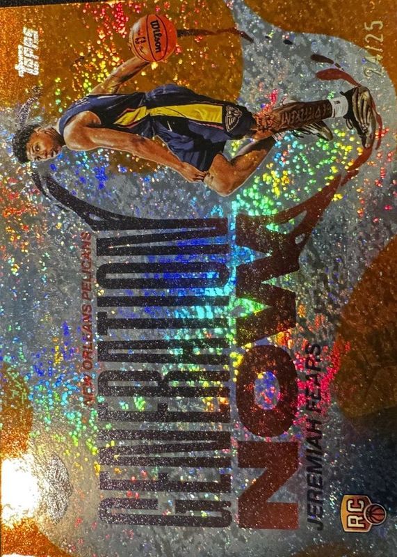 The Jeremiah Fears 2025 Topps #GN-7 Generation Now - Orange Holo Foil /25 Rookie card in Raw condition has not changed in price in the last 30 days and was last sold for $57.00 .